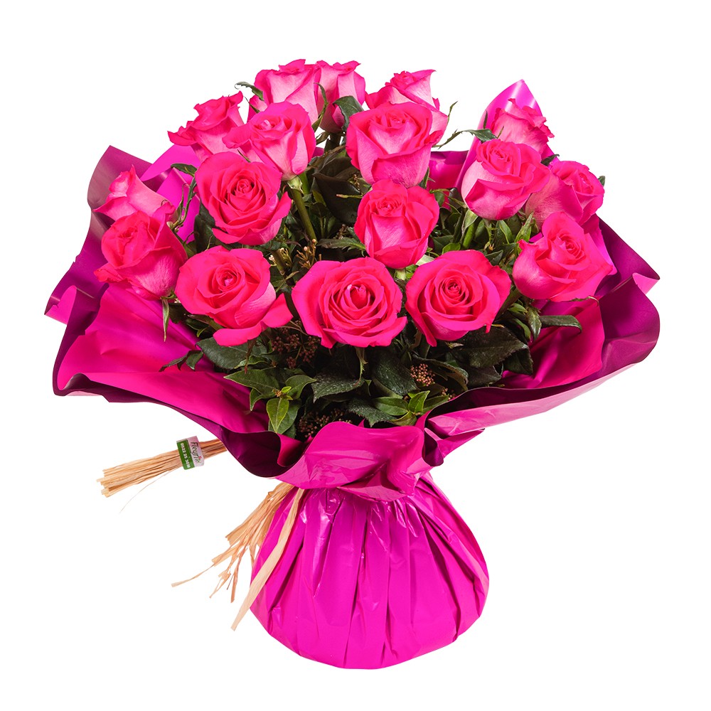 Superbe bouquet dans une poche d'eau dans les tons de rose fushia. Un grand classique Fleuritel pour les amoureux du rose !