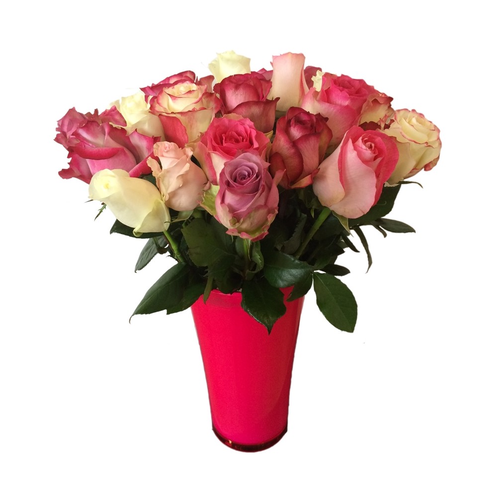Bouquet de 15 roses dans un vase Fizzy. Super qualité de fleurs dans un vase super tendance de couleur assortie. Pour toutes les occasions..